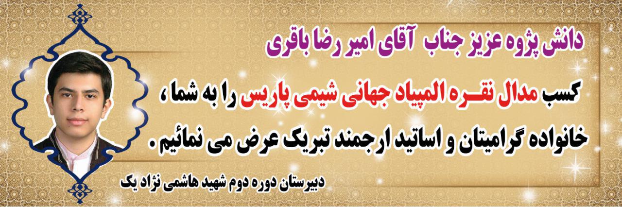 کسب مدال نقره المپیاد شیمی فرانسه تیرماه 1398 توسط دانش آموز امیر رضا باقری از دبیرستان هاشمی نژاد1 مشهد را به ایشان، خانواده، دبیران و مسئولین دبیرستان تبریک می گوییم